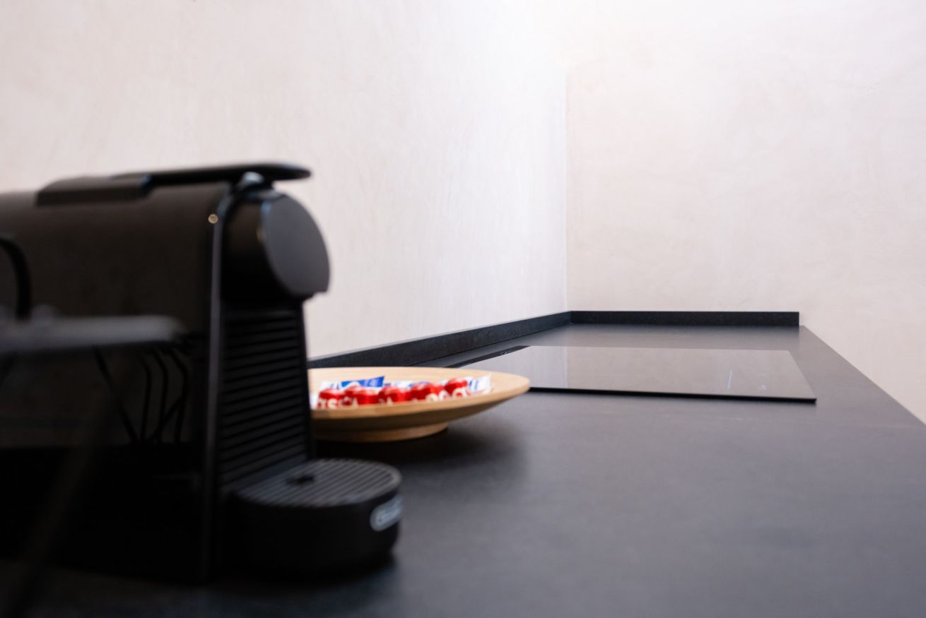 La cucina, moderna e completamente attrezzata, offre tutto il necessario per cucinare qualsiasi pietanza e dispone di un pratico angolo cottura, un frigo e di una macchina da caffè con cialde incluse.