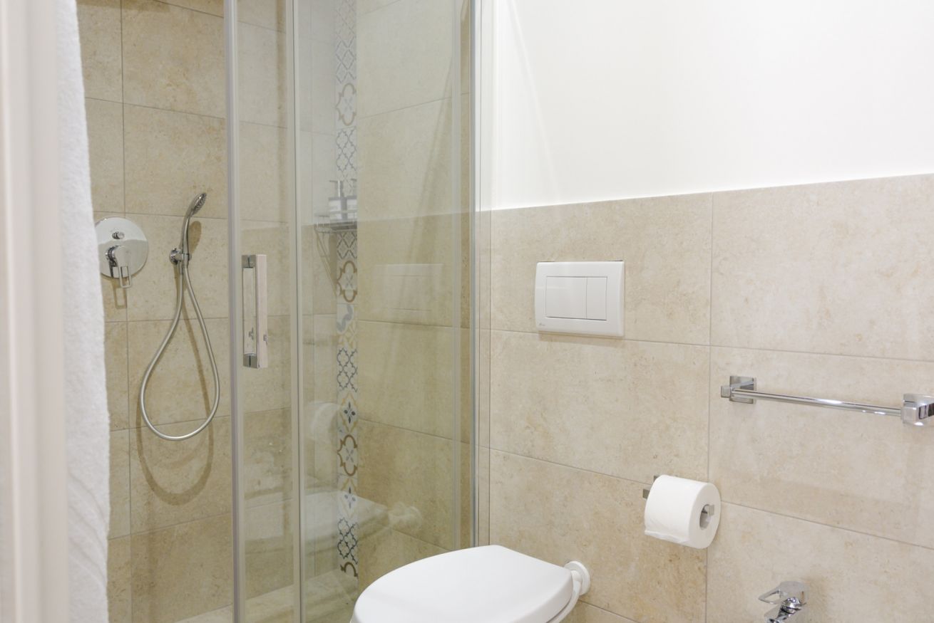 Il bagno, ampio e moderno, è dotato di una grande cabina doccia che coniuga praticità e relax.