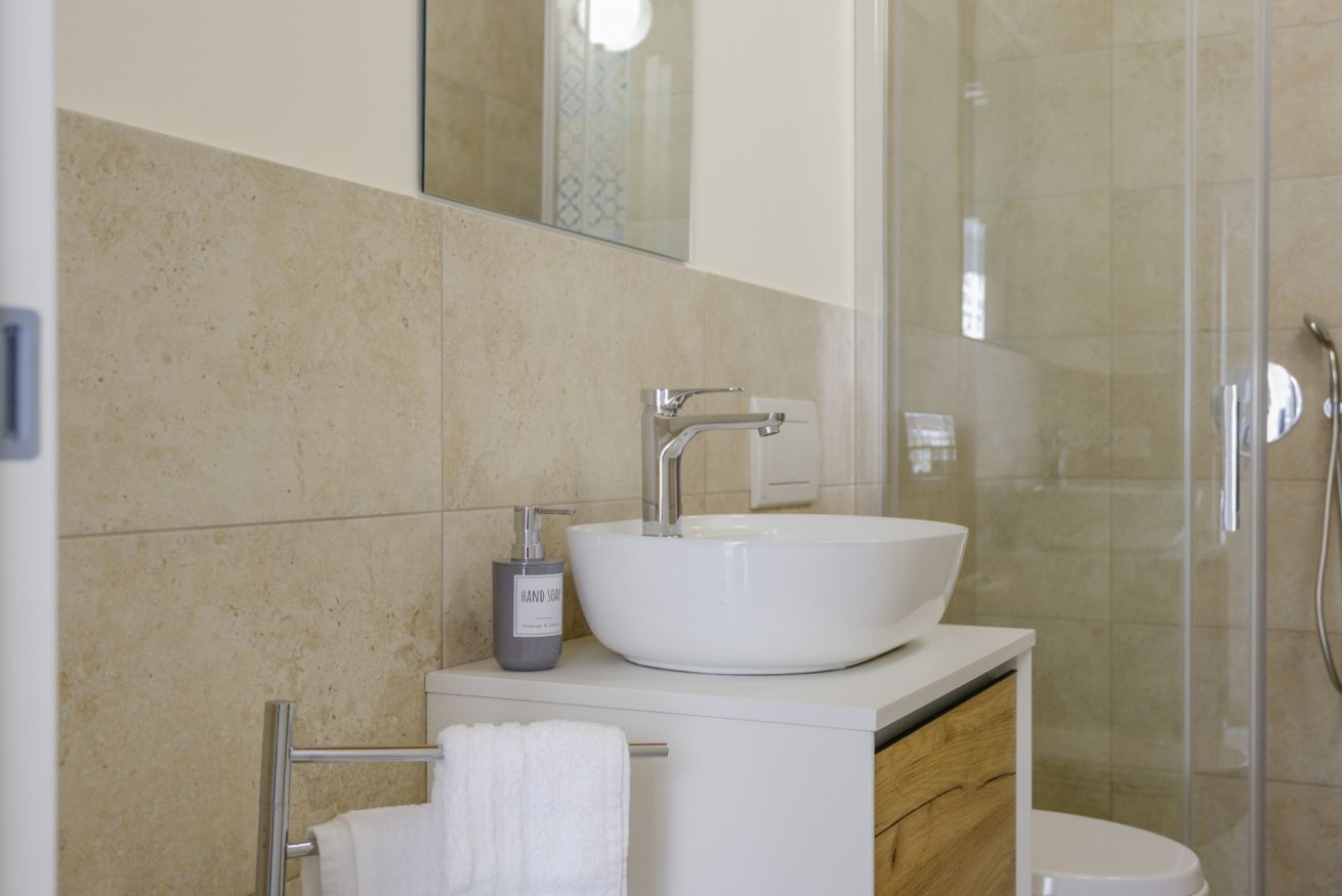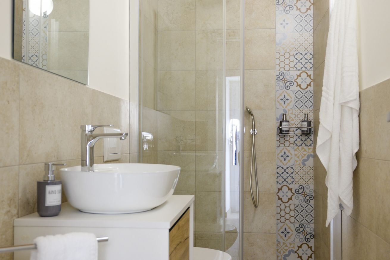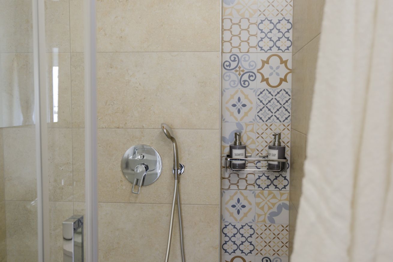 Il bagno privato, spazioso e funzionale, è dotato di un’ampia cabina doccia e di tutti i comfort necessari per un soggiorno piacevole.